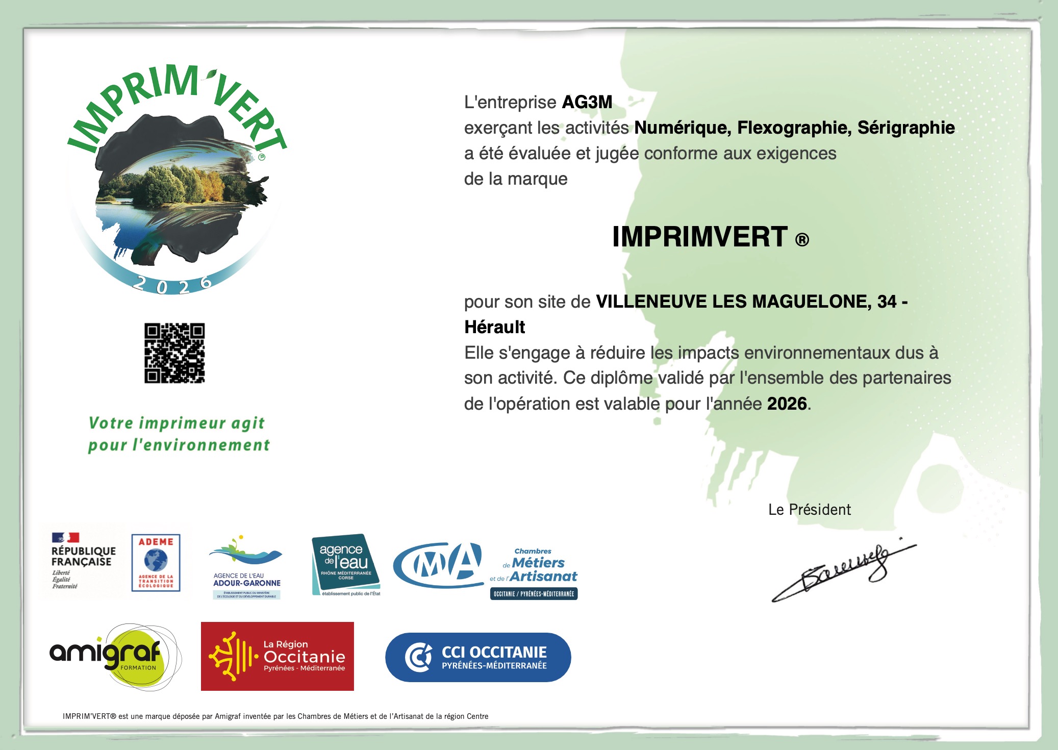 Depuis plus de 20 ans, AG3M conjugue innovation et écologie. Le secteur de l’imprimerie était, et peut encore être, très polluant : encres, solvants, consommation énergétique, gaspillage papier, etc. Ag3m a sans cesse orienté ses choix industriels pour limiter voire supprimer son impact environnemental. C’est donc avec plaisir que nous recevons cette année encore notre certification Imprimvert.